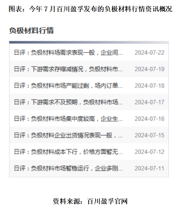 7月22日,大宗商品资讯信息服务商百川盈孚发布的《日评:负极材料场需求表现一般,企业间订单抢夺不断》显示,负极材料市场交投氛围偏淡,从市场反馈来看,下游电芯企业近期需求表现一般,负极材料市场场内询单量下行,实际新增订单寥寥,中小型负极企业生存压力仍存,企业间订单抢夺不断,市场竞争激烈。