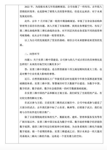 在试点参与方面:目前实景三维的试点城市中,公司中标或参与建设了大部分的试点,去年我们新中标了山东省、株洲等。后续基于试点,我们也将与合作伙伴进行联合推广。