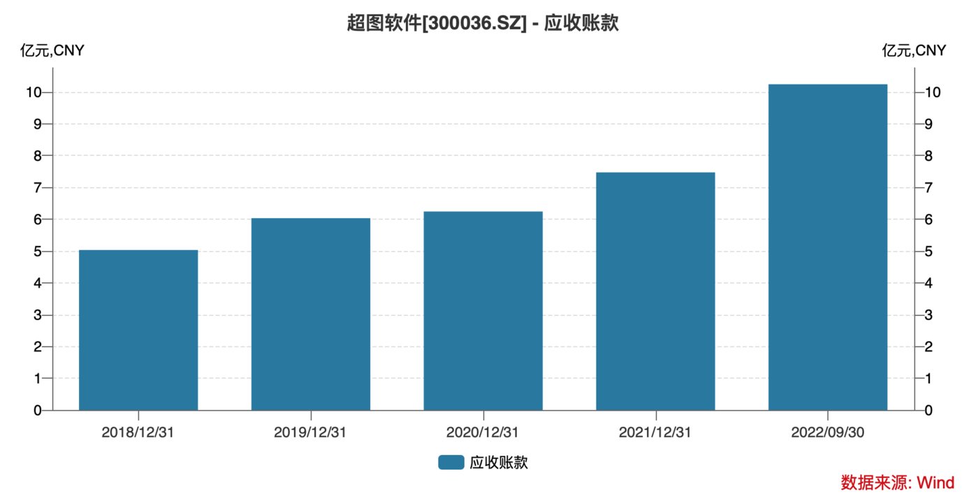 前些年公司由于多次进行并购确实拉高了收入,但应收账款高企也成了超图软件的“顽疾”,且近几年应收账款增速惊人,已超过营收增速。2019至2022年三季度末,公司应收账款分别为6.03亿元、6.24亿元、7.47亿元和10.24亿元。同期,应收账款周转率呈下滑态势,分别为3.14次、2.62次、2.73次和1.13次。