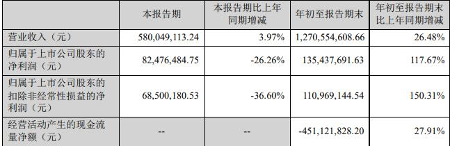 2023年前三季度,公司实现营业收入12.71亿元,同比增长26.48%;实现归属于上市公司股东的净利润1.35亿元,同比增长117.67%;实现归属于上市公司股东的扣除非经常性损益的净利润1.11亿元,同比增长150.31%,经营活动产生的现金流量净额为-4.51亿元。