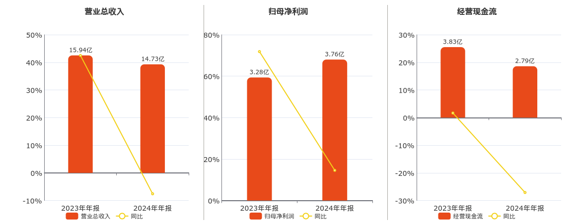 公司营业总收入为14.73亿元,较去年同报告期营业总收入减少1.21亿元,同比较去年同期下降7.57%。归母净利润为3.76亿元。经营活动现金净流入为2.79亿元,较去年同报告期经营活动现金净流入减少1.04亿元,同比较去年同期下降27.10%。