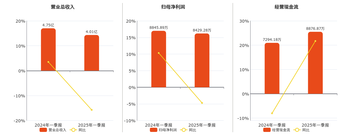 公司营业总收入为4.01亿元,较去年同报告期营业总收入减少7485.75万元,同比较去年同期下降15.74%。归母净利润为8429.28万元,较去年同报告期归母净利润减少416.61万元,同比较去年同期下降4.71%。经营活动现金净流入为8876.87万元。