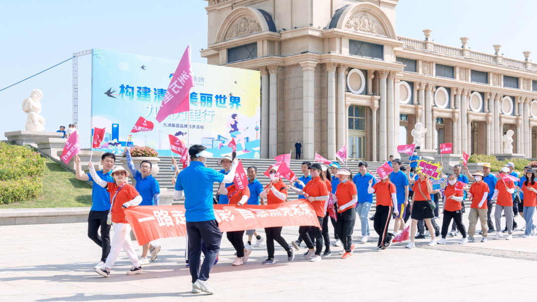 随着董事长李寅下达徒步活动开拔号令,各方阵人员扬起九洲旗帜,踏着整齐的步伐,有序出发,在感受自然风光的同时,享受运动带来的惬意。