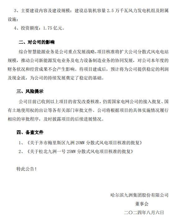 近日,哈尔滨九洲集团股份有限公司(以下简称“本公司”或“九洲集团”)收到黑龙江省发展和改革委员会(以下简称“省发改委”)《关于齐市梅里斯区九洲 20MW分散式风电项目》(黑发改新能源【2024】544号)、《关于松北九洲一号25MW 分散式风电项目核准的批复》(黑发改新能源【2024】543号)。省发改委对以上项目给予核准,主要批复内容如下: