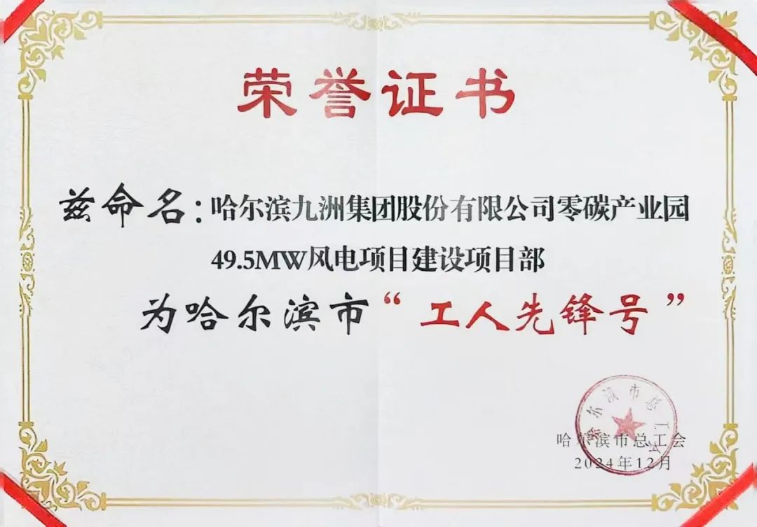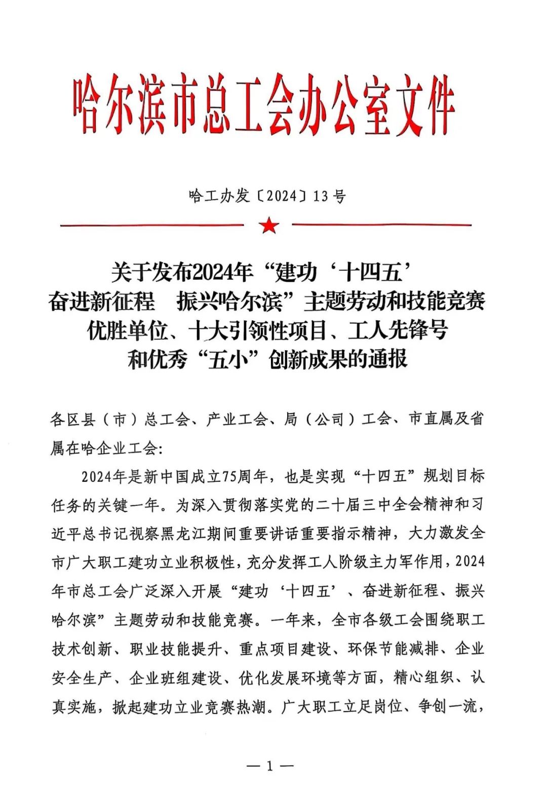 近日,哈尔滨市总工会发布《关于发布2024年“建功’十四五奋进新征程振兴哈尔滨”主题劳动和技能竞赛优胜单位、十大引领性项目、工人先锋号和优秀“五小”创新成果的通报》,九洲集团荣获“工人先锋号”荣誉称号。