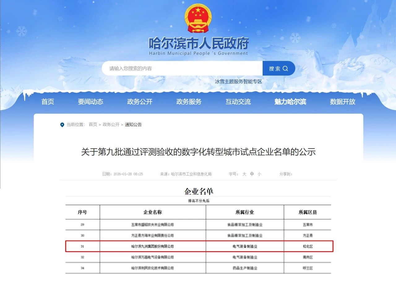 近日,哈尔滨市工信局公布第九批数字化转型试点企业名单,哈尔滨九洲集团股份有限公司成功入选。这是继子公司哈尔滨九洲电气技术有限责任公司入选第五批试点企业后,集团在数智化转型领域获得的又一权威认可,标志着九洲集团“智转数改”战略已从子公司试点验证迈向集团层面体系化落地,整体数智化能力迈入新阶段。