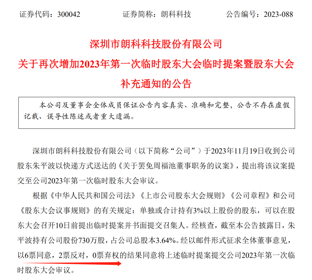 根据计划,朗科科技将于11月29日召开2023年第一次临时股东大会,但是,在股东大会召开前夕,小股东却突然提交罢免董事长周福池的议案,且该提案获得多数董事同意,同意提交股东大会审议。