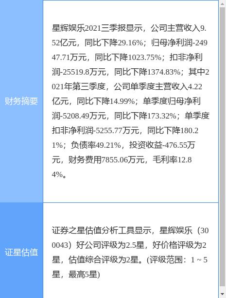 星辉娱乐披露2021年度业绩预告,预计2021年度实现归属于上市公司股东的净利润为亏损4.95亿元-7.06亿元,上年同期为盈利2601.40万元;预计2021年度实现归属于上市公司股东的扣除非经常性损益后的净利润为亏损5.02亿元-7.13亿元,上年同期为盈利1391.05万元。
