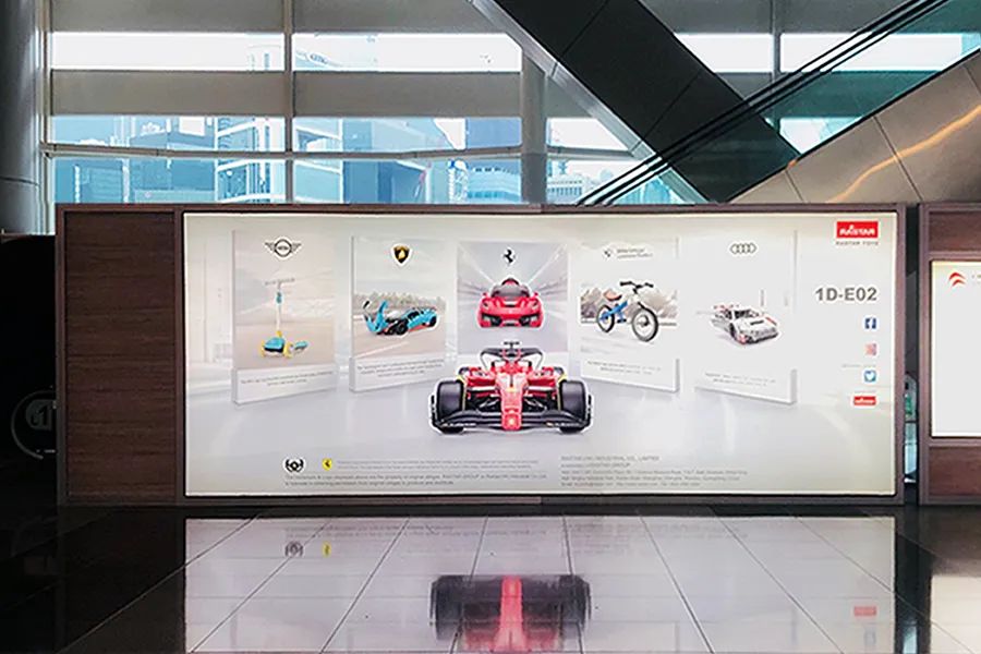 星辉娱乐旗下新品法拉利F1-75方程式赛车在香港玩具展上最瞩目的灯箱牌上展示