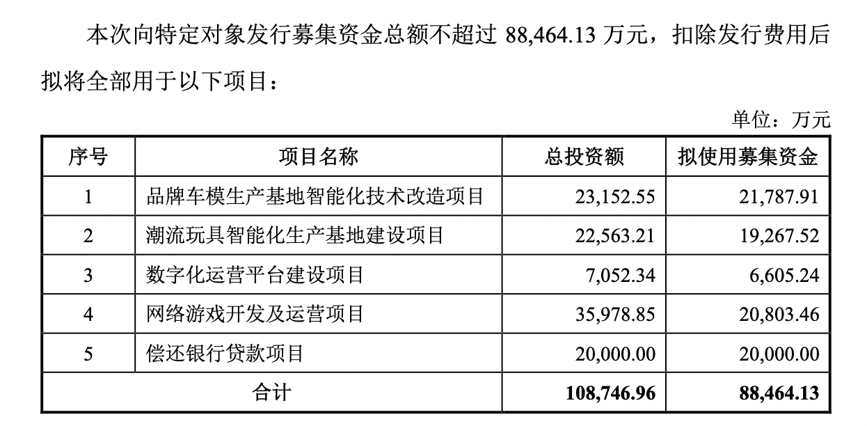 2023年5月,星辉娱乐发布定增计划,拟向特定对象发行股份募集资金不超过8.85亿元,用于投品牌车模生产基地智能化技术改造、潮流玩具智能化生产基地建设等项目。