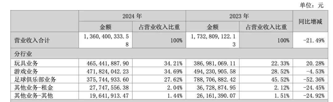其中,公司足球俱乐部业务营收同比下滑52.36%至3.76亿元,仅占总营收的27.62%,占比甚至还不及2016年的水平;同时,该板块净亏损高达2.5亿元。