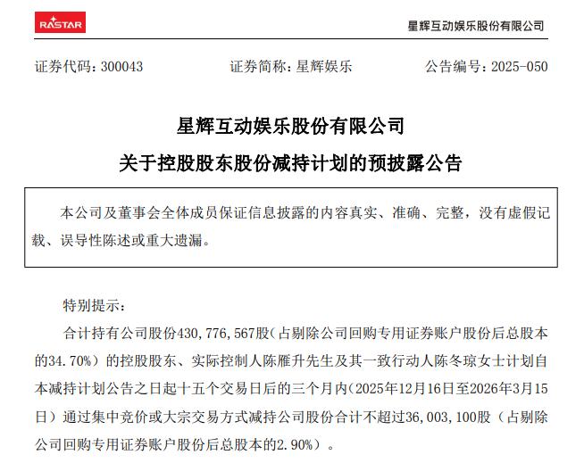 根据 星辉娱乐 发布的公告,近期收到控股股东、实际控制人陈雁升先生及其一致行动人陈冬琼女士出具的《股份减持计划告知函》,计划公告之日起十五个交易日后的三个月内通过集中竞价或大宗交易方式减持 星辉娱乐 股份合计不超过36,003,100股(占剔除公司回购专用证券账户股份后总股本的2.90%),原因为“股东自身资金需求”。