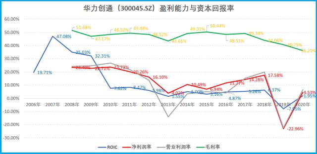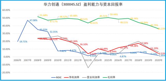 但上市以来,华力创通的毛利率一度平稳,但近4年开始下滑,而净利润率总体下行。2020年毛利率只有2010年刚上市的时候的76.81%、净利润率只有刚上市时的19.10%、ROIC只有刚上市时的28%。