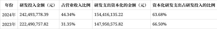 2024年研发投入金额为242,493,778.39元,占营业收入比例达44.34%,研发支出资本化的金额为154,416,135.22元,资本化研发支出占研发投入的比例为63.68%。高比例的研发投入体现了公司对技术创新的重视,持续投入有望为公司未来发展提供技术支撑,但短期内可能对利润产生一定压力。