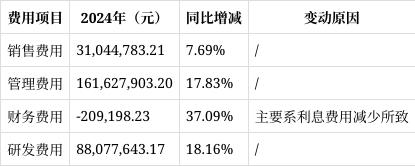 2024年公司费用呈现不同程度变化。销售费用为31,044,783.21元,同比增长7.69%;管理费用161,627,903.20元,同比增长17.83%;财务费用-209,198.23元,同比增长37.09%,主要系利息费用减少所致;研发费用88,077,643.17元,同比增长18.16%。整体费用的增长,在营收下滑的背景下,进一步压缩了利润空间,公司需强化成本控制,提高费用使用效率。