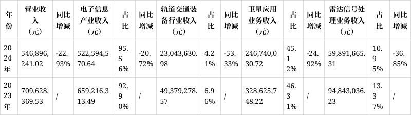 2024年,华力创通营业收入为546,896,241.02元,较2023年的709,628,369.53元下降22.93%。从业务板块来看,电子信息产业收入522,594,570.64元,占比95.56%,同比下降20.72%;轨道交通装备行业收入23,043,630.98元,占比4.21%,同比下降53.33%。卫星应用业务收入246,740,030.72元,占比45.12%,同比下降24.92%;雷达信号处理业务收入59,891,665.31元,占比10.95%,同比下降36.85%。公司需深入分析各业务板块下滑原因,优化业务结构,提升市场竞争力。
