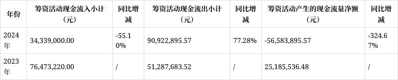 筹资活动现金流入小计为34,339,000.00元,较2023年的76,473,220.00元下降55.10%;筹资活动现金流出小计为90,922,895.57元,较2023年的51,287,683.52元增长77.28%,筹资活动产生的现金流量净额为-56,583,895.57元,同比下降324.67%。公司筹资活动现金流入减少,流出增加,需关注偿债压力,合理安排筹资计划,确保资金链稳定。