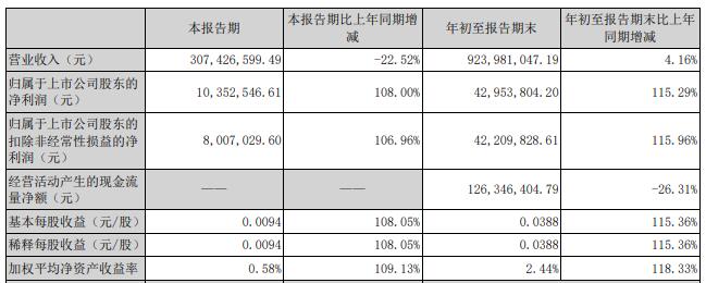 今年第三季度,合康新能实现营业收入3.07亿元,同比减少22.52%;归属于上市公司股东的净利润1035.25万元,同比增长108.00%;归属于上市公司股东的扣除非经常性损益的净利润800.70万元,同比增长106.96%。