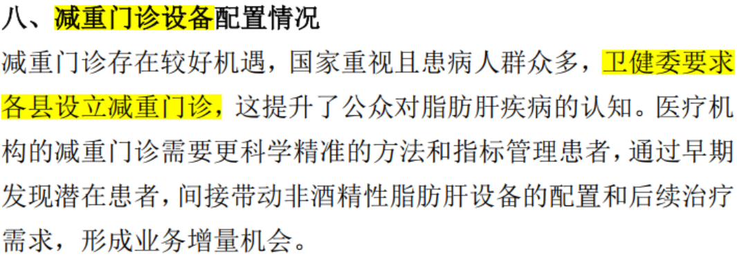 另一方面,减肥药的广阔前景,也将肝脏检测设备的应用场景,从肝病科扩散至消化科、内分泌科、初级保健和社区管理等领域,带动其在相关应用场景渗透率的持续提升。