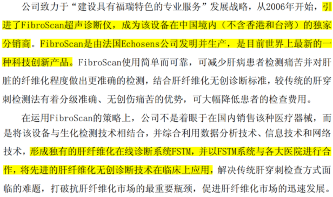 福瑞股份最早只是FibroScan中国境内独家分销商,FibroScan由法国Echosens公司发明生产,福瑞股份在硬件基础上,研发出肝纤维化在线诊断系统FSTM,同各大医院进行合作。