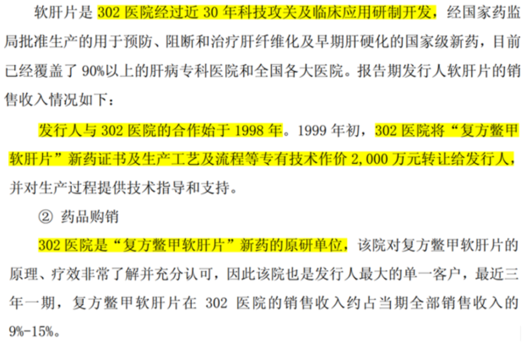 复方鳖甲软肝片(软肝片)是302医院30年科技攻关的成果,福瑞股份1998年成立就跟302医院建立了合作关系,并在1999年初以2000万拿下软肝片的新药证书和生产工艺及流程。