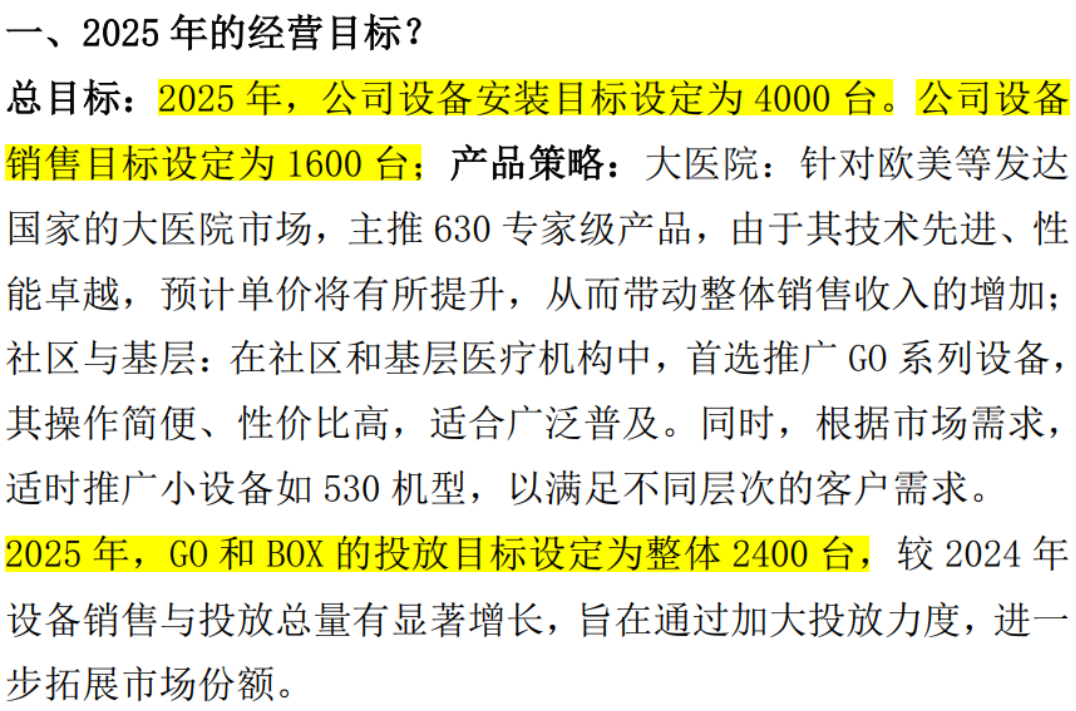 在接受调研时,福瑞股份还表示,2025年总的设备安装目标是4000台,其中FibroScan Go和BOX的总体目标是2400台,差不多是2024年底总装机量的4倍。设备的销售目标是1600台,在2024年基础上增长23%。