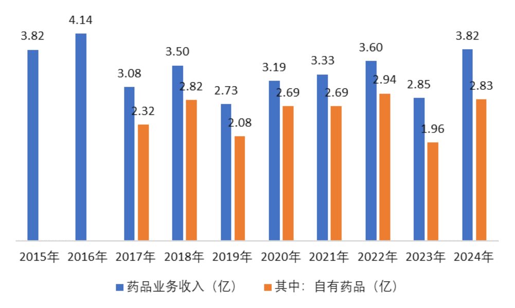 拉长时间轴来看,过去十年,福瑞股份药品业务收入总营收基本维持在3.5亿左右,几乎没有明显的增长。虽然自有药品业务2024年营收2.83亿,同比增长44.31%,但主要跟2023年营收大幅下滑,基数低有关。