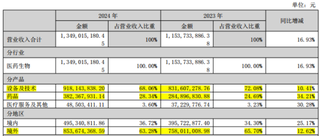 2024年年报显示,公司收入主要来自药品和设备及技术两大块,药品收入占比约在3成,设备及技术约在7成,当年总营收13.49亿,同比增长16.93%,超6成收入来自境外。