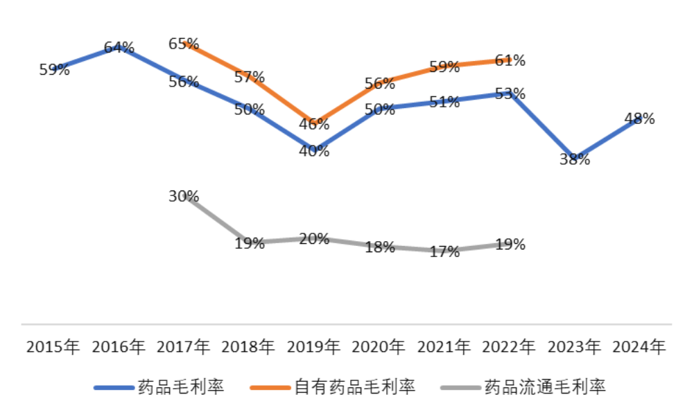 药品业务的整体毛利率在50%上下,比较稳定,自有药品毛利率更高一些,60%左右,这意味着药品业务面临的最主要矛盾就是增长的问题。