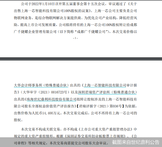 1月10日晚间,世纪鼎利发布公告称,公司于2022年1月10日召开第五届董事会第十五次会议,审议通过了《关于出售上海一芯智能科技有限公司100%股权的议案》。具体来看,世纪鼎利拟将持有的上海一芯公司100%股权转让给成都广千捷耀企业管理有限公司,出售价格为人民币14400万元。