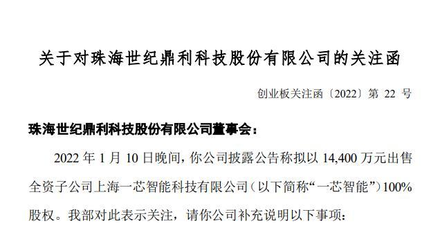 1月13日,深交所向世纪鼎利(300050.SZ)下发关注函,要求世纪鼎利就拟以1.44亿元,折价近80%出售子公司一芯智能100%股权事项,说明本次交易作价的合理性与公允性;交易对手方相关股东与公司控股股东、实控人等是否存在关联关系或其他可能导致利益倾斜的关系。