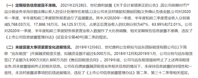关于第1项定期报告信息披露不准确的情况,世纪鼎利对2020年一季度、半年度和前三季度营业收入分别调减5768.03万元、17868.16万元、34125.51万元,占更正后营业收入的比例分别为47%、63.99%和72.01%。
