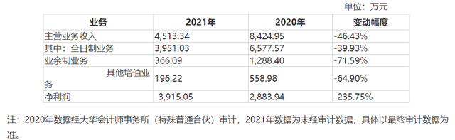 上海美都2021年主营业务收入4513.34万元,同比下降46.43%;净利润亏损3915.05万元,同比下降235.75%。报告期内,上海美都的全日制业务收入锐减至3951.03万元,较2020年同期减少2626.54万元,下降了39.93%。主要原因是新冠疫情仍然持续影响,对上海美都以国际留学为核心的全日制业务在招生方面产生较大的冲击。