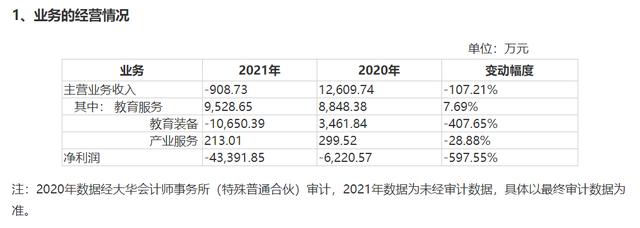 回复函显示,报告期内,上海智翔教育装备产品业务收入出现了严重的下滑。2021年主营业务收入-908.73万元,同比下降107.21%;净利润亏损4.34亿元,同比下降597.55%。