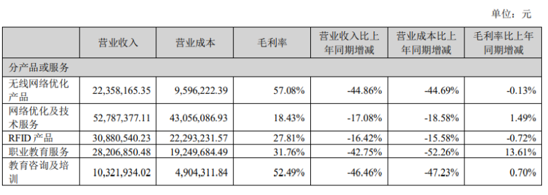 关于营收减少,公司称主要系报告期内通信物联网及教育业务订单下降所致。今年上半年,世纪鼎利旗下无线网络优化产品、网络优化及技术服务、RFID产品、职业教育服务、教育咨询及培训分别带来收入2235.82万元、5278.7万元、3088万元、2820.6万元、1032.2万元,同比均有所下降。