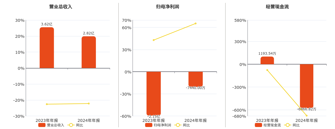 公司营业总收入为2.82亿元,较去年同报告期营业总收入减少8040.35万元,同比较去年同期下降22.20%。归母净利润为-7440.00万元。经营活动现金净流入为-6866.82万元,较去年同报告期经营活动现金净流入减少8060.36万元,同比较去年同期下降675.33%。