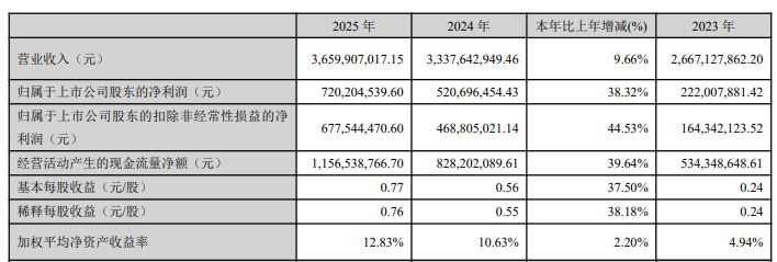 3月26日晚间,鼎龙股份(SZ300054,股价45.23元,市值428.81亿元)披露2025年年报。该年报显示,鼎龙股份2025年全年实现营收36.6亿元,同比增长9.66%;实现归母净利润7.2亿元,同比增长38.32%,但低于机构一致预测值的约7.28亿元;实现扣非归母净利润6.78亿元,同比增长44.53%。基本每股收益0.77元。同时,公司预计2026年第一季度归属于上市公司股东的净利润为2.4亿元~2.6亿元,同比增长70.22%~84.41%,环比增长19.53%~29.49%。