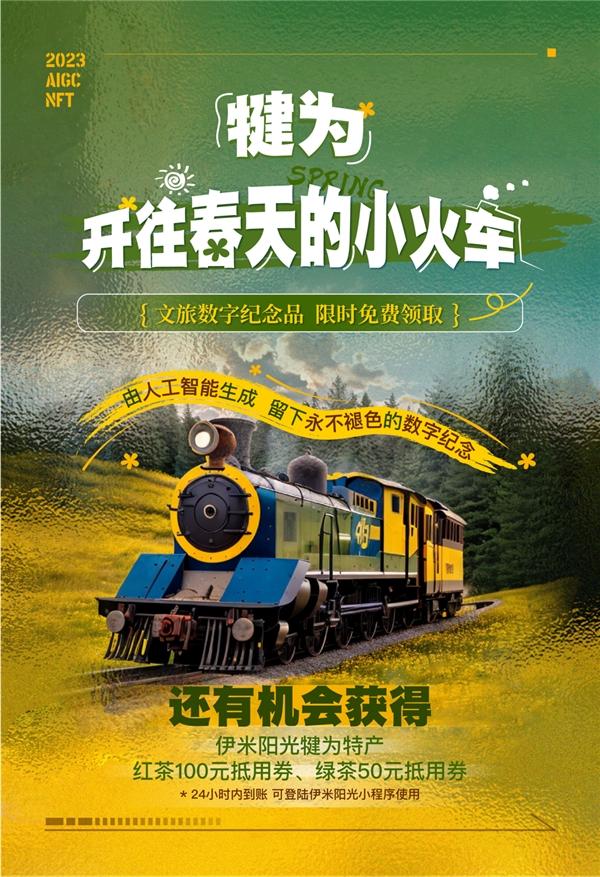 此次升级改造创新加入“数字纪念品”板块:4月28日起,游客可于犍为“心连心”文旅服务岗、清溪古镇码头广场、犍为文庙等地扫描对应海报二维码,免费领取犍为文旅专属数字纪念品「犍为·开往春天的小火车」,留下独一无二的数字旅行纪念。此系列数字纪念品,以嘉阳小火车为灵感,使用时下前沿的AIGC(AI generated content,人工智能生成内容)技术制作,共99款,每款各100个,共计9900个,所有游客均可免费随机领取。领取到数字纪念品编号最后两位数字为“99”的99位幸运用户,还可获得伊米阳光提供的100元特产红茶抵用券或50元特产绿茶抵用券优惠。五一期间,已有近3000名游客踊跃领取,留下独特的数字纪念凭证。