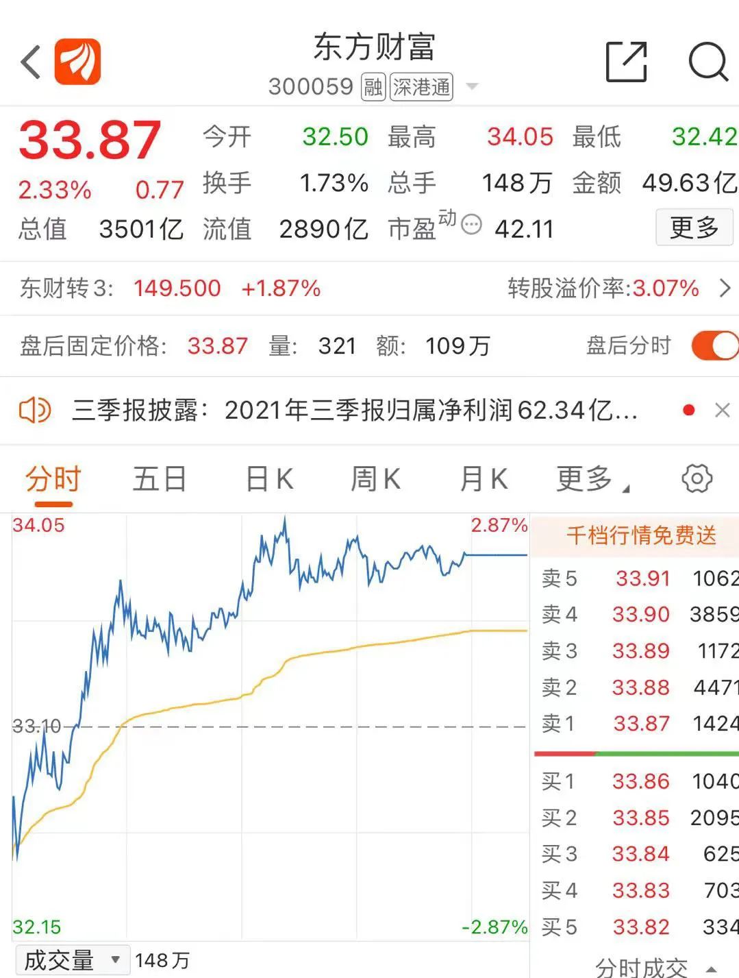 根据东方财富公布的三季报显示,公司前三季度实现营收96.36亿元,同比增长62.07%;归母净利润62.34亿元,同比大增83.48%,可以说是交出了一份相当亮眼的成绩单。