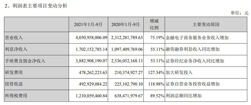 从三季报来看,2021年前三季度,东方财富营收、净利润均实现大幅增长。报告期内,公司金融电子商务服务业务收入增加。