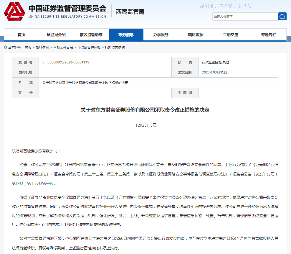 决定指出,经查,东方财富证券在2023年3月21日的网络安全事件中,存在信息系统升级论证测试不充分、未及时报告网络安全事件的问题。依据相关规定,西藏证监局决定对东方财富证券采取责令改正的监督管理措施。同时,责令东方财富证券对此次事件相关责任人员进行内部责任追究,并妥善处置此次事件引发的投资者诉求。