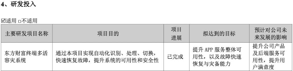 研发投入项目中,名为“东方财富终端多活容灾系统”的项目进展是“已完成”,拟达到的目标是“提升 APP 服务整体可用性,以及故障快速恢复与灾备能力”