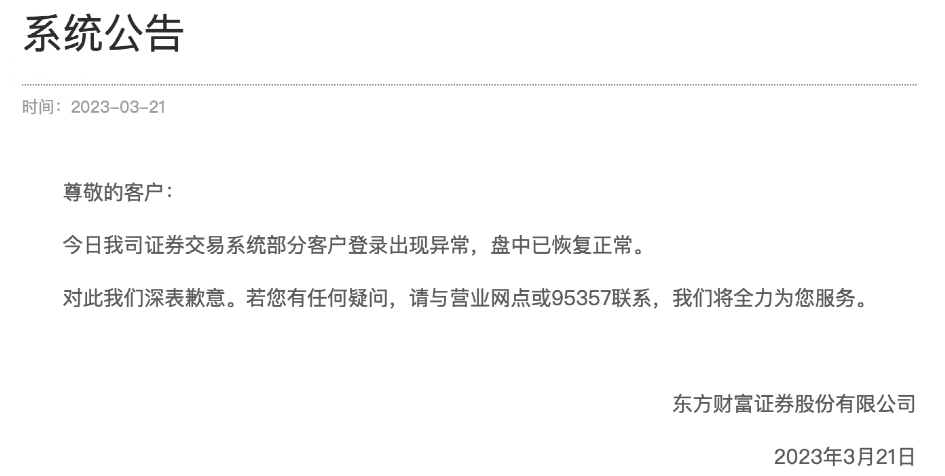 当天,东方财富证券在官网披露系统公告,表示交易系统登陆异常的情况在盘中已恢复,但未说明原因。董秘办工作人员给媒体的回应是,原因需要与技术部门确认后再具体回复。