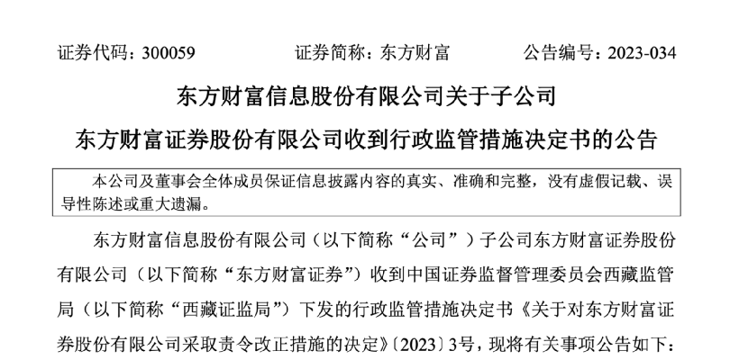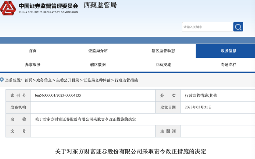 3月31日晚间,西藏证监局官网发布了对东方财富证券采取责令改正措施的决定。