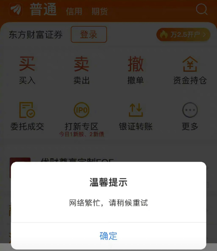 3月21日上午,多位投资者在社交平台上称东方财富证券交易软件“宕机”无法正常登录交易,并出现“网络繁忙,请稍后重试”的提示字样,随后#东方财富#词条登上热搜。