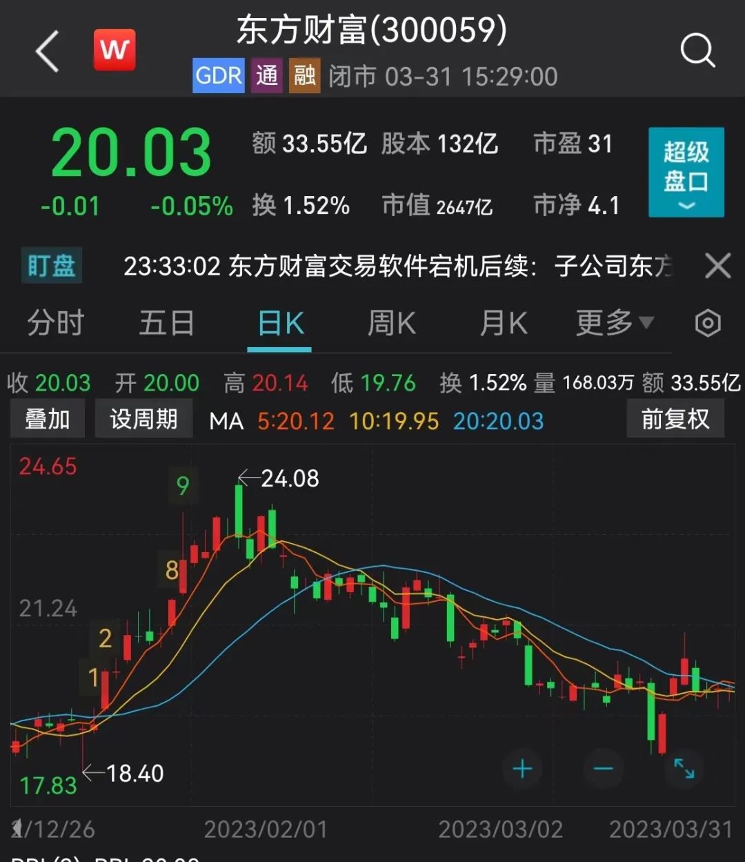 截至3月31日,东方财富收于20.03元,市值2647亿元。