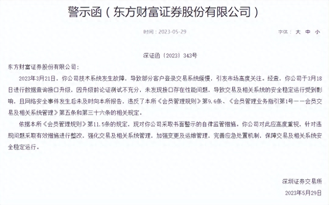 值得注意的是,5月29日,深交所发布了对东方财富证券的警示函。深交所表示,2023年3月21日,东方财富证券技术系统发生故障,导致部分客户登录交易系统缓慢,引发市场高度关注。经查,东方财富证券于3月18日进行数据查询接口升级,因升级前论证测试不充分,未发现接口存在性能问题,导致交易及相关系统的安全稳定运行受到影响,且网络安全事件发生后未及时向深交所报告,违反了深交所相关规定。