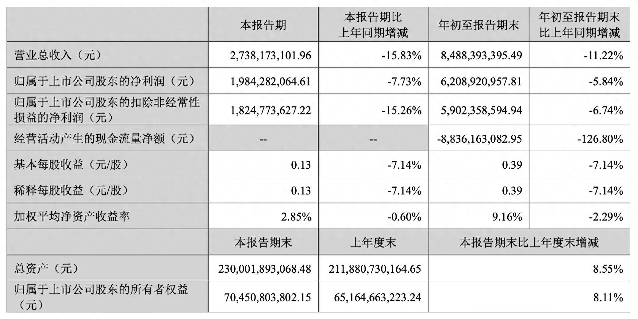 东方财富第三季度营业总收入27.38亿元,同比下降15.83%;归母净利润19.84亿元,同比下降7.73%。