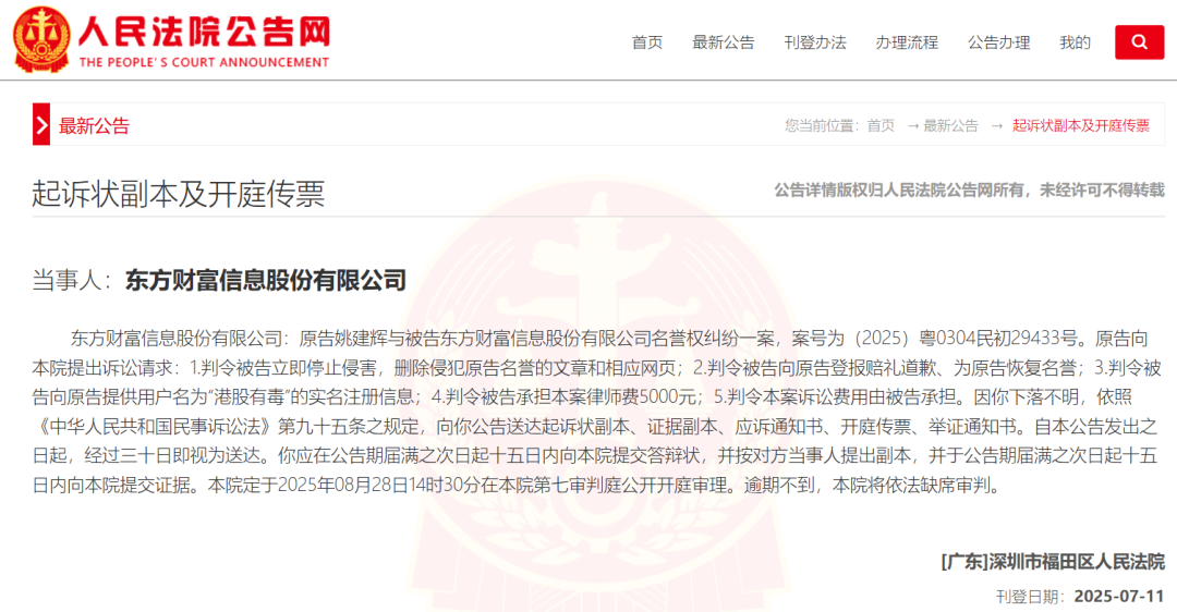 公告内容显示,原告姚某某诉东方财富信息股份有限公司名誉权纠纷案,案号为:(2025)粤0304民初29433号,因东方财富下落不明,福田区法院公告送达起诉状副本及开庭传票,预定于2025年8月28日开庭审理。