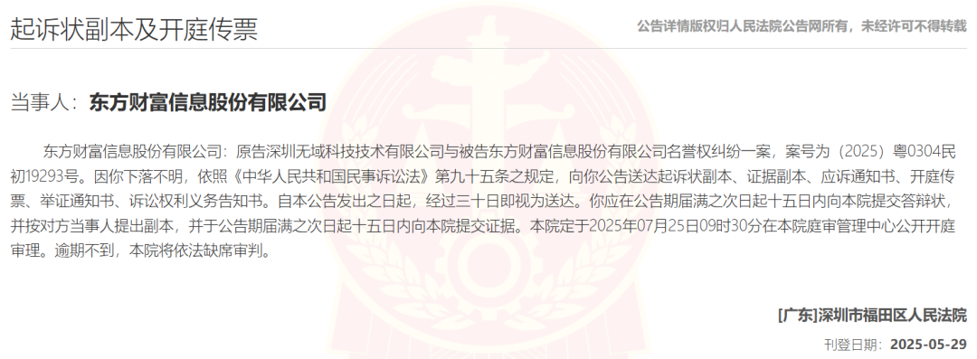 无独有偶,今年5月29日,福田区法院同样因为东方财富下落不明,公告送达(2025)粤0304民初19293号名誉权纠纷案开庭公告。这起案件的原告深圳无域科技技术有限公司,为小贷机构,拥有品牌“省呗”。福田区法院公告显示,定于今年7月25日开庭审理。